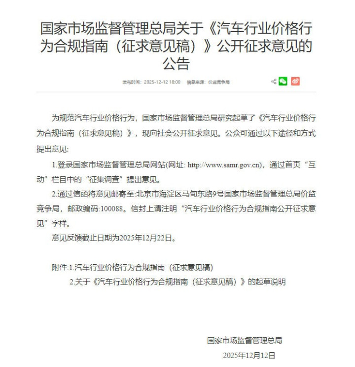 12月12日,国家市场监督管理总局发布《汽车行业价格行为合规指南(征求意见稿)》,向社会公开征求意见,旨在规范汽车行业价格行为。《指南》细化了汽车生产企业价格行为规范,明确了从整车到零配件生产、从定价策略到销售行为各环节的价格合规要求。